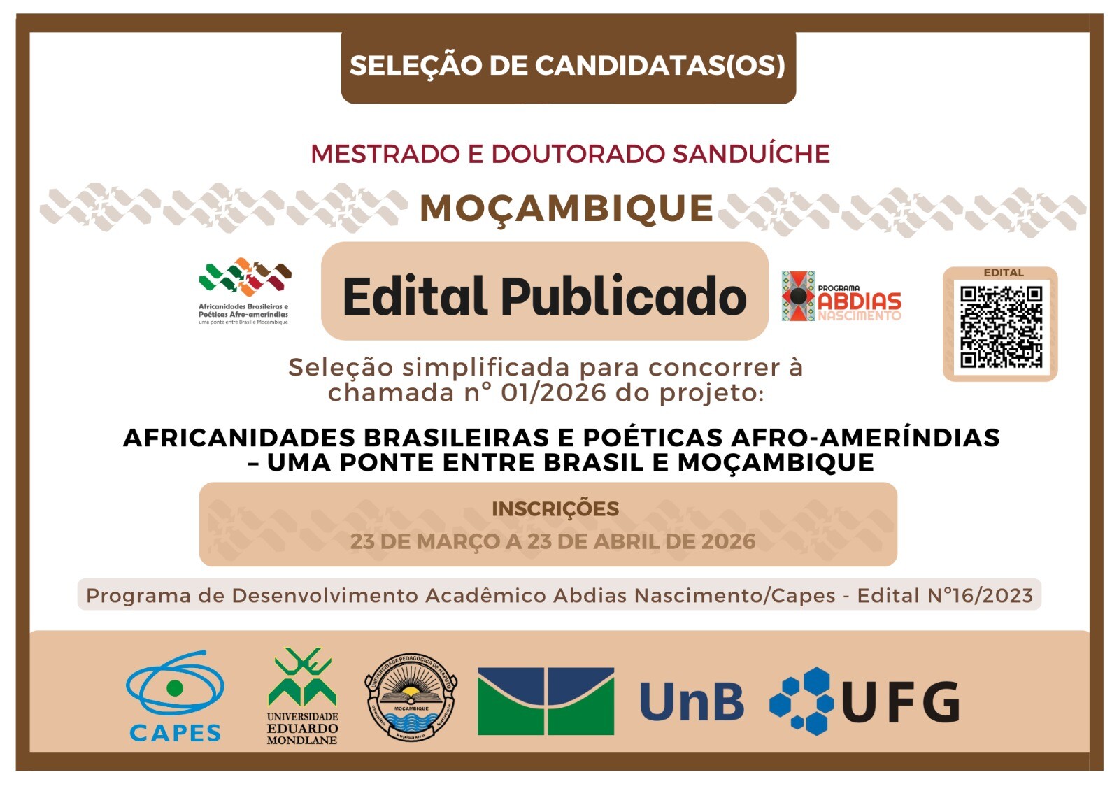 Estão abertas as inscrições para a _Chamada Simplificada nº 01/2026_ do projeto Africanidades Brasileiras e Poéticas Afro-Ameríndias – uma ponte entre Brasil e Moçambique, no âmbito do Programa de Desenvolvimento Acadêmico Abdias Nascimento/CAPES (Edital nº 16/2023).